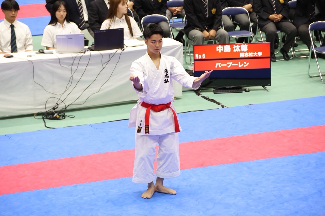 TOP > トピックス > 【空手道部】創部初、同志社生同士の決勝!9年ぶり、男子個人形・渡邊湧斗(社会4)が日本一!(第69回全日本学生空手道選手権大会個人戦の結果) > 初出場で準優勝の中島汰尊(スポ健1回) 2025年7月18日 初出場で準優勝の中島汰尊(スポ健1回)